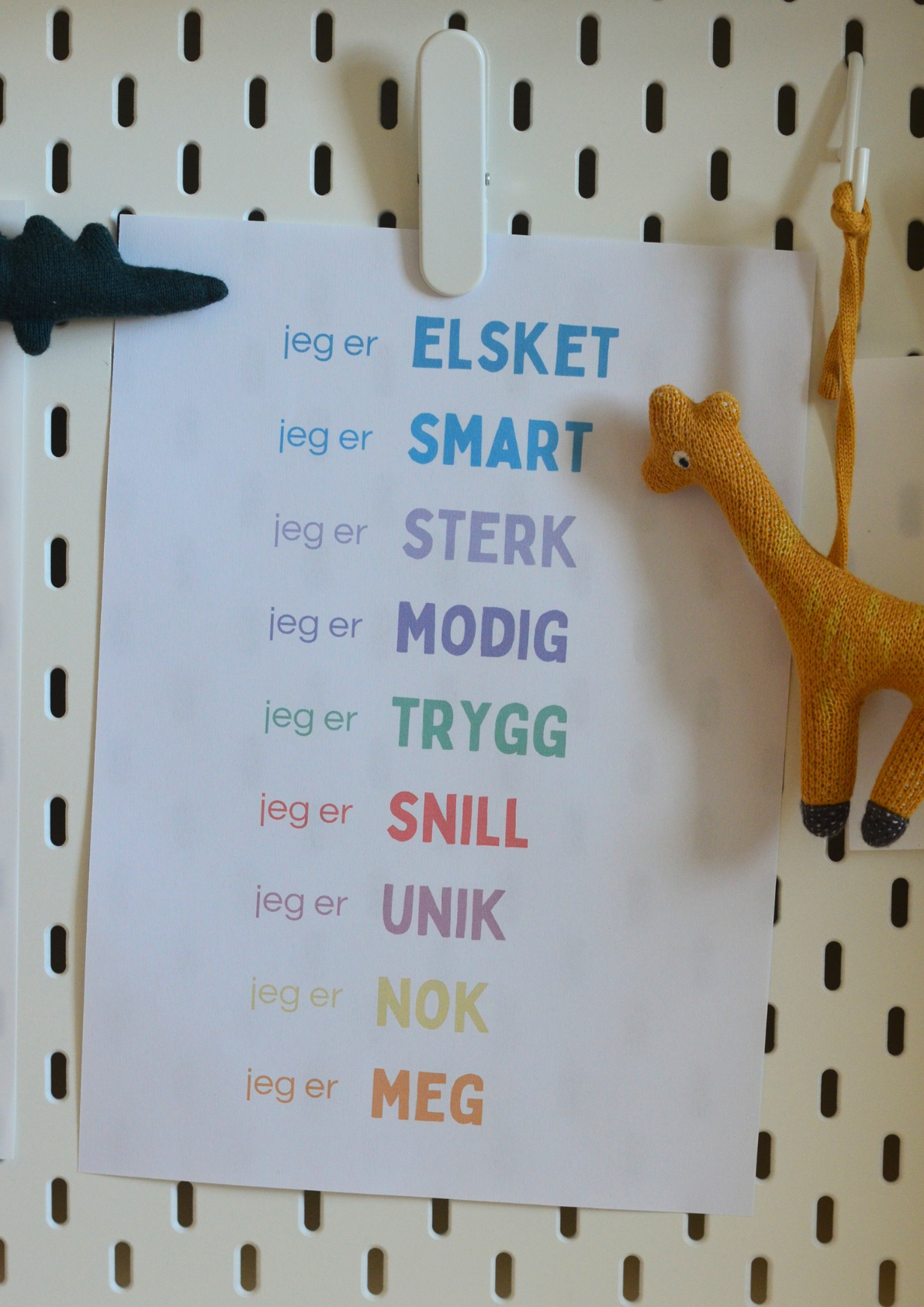 Disse plakatene er laget for å gi små påminnelser i hverdagen – om trygghet, mestring, ro og egen verdi. Når barna ser det daglig, blir det en naturlig del av rutinene deres.