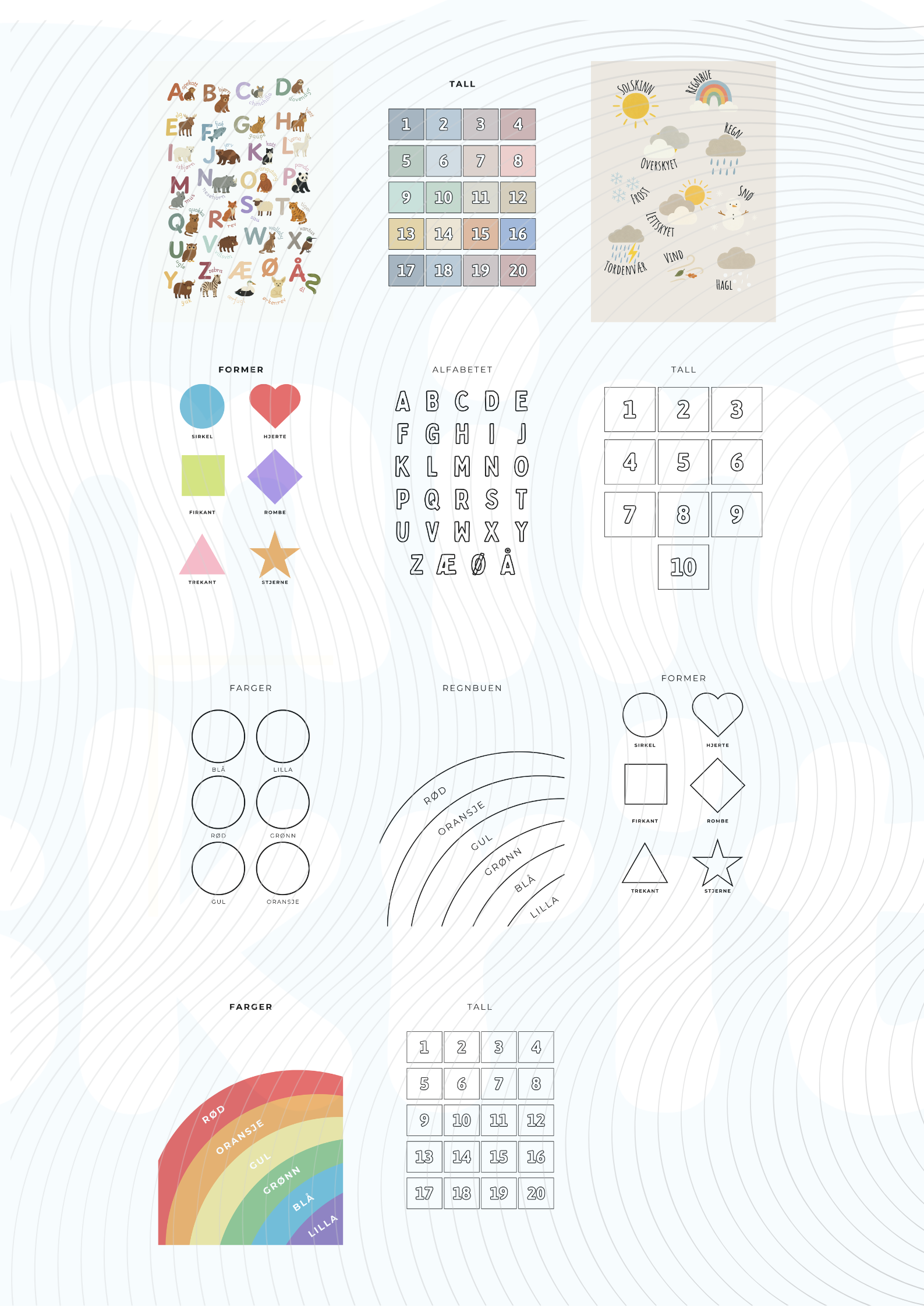 En serie kreative fargeleggingsplakater som kombinerer bokstaver, tall, farger og former på ett sted. Perfekt som en rolig aktivitet hvor barnet både lærer og utfolder seg – samtidig som begrepene forsterkes gjennom fargelegging.