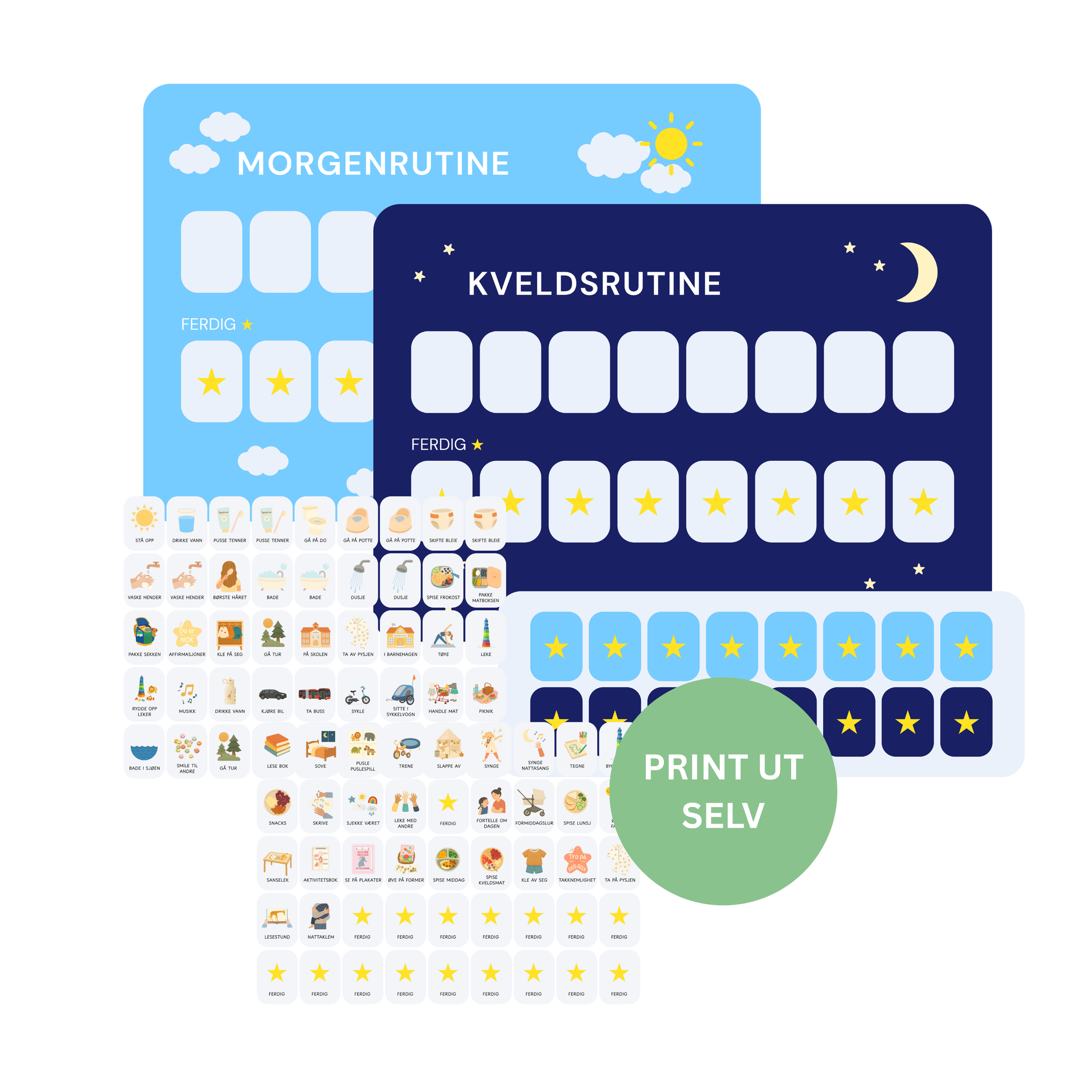 Morgen- og kveldsrutine – Komplett visuell rutine med stjerner (70+ ikoner, print ut selv)