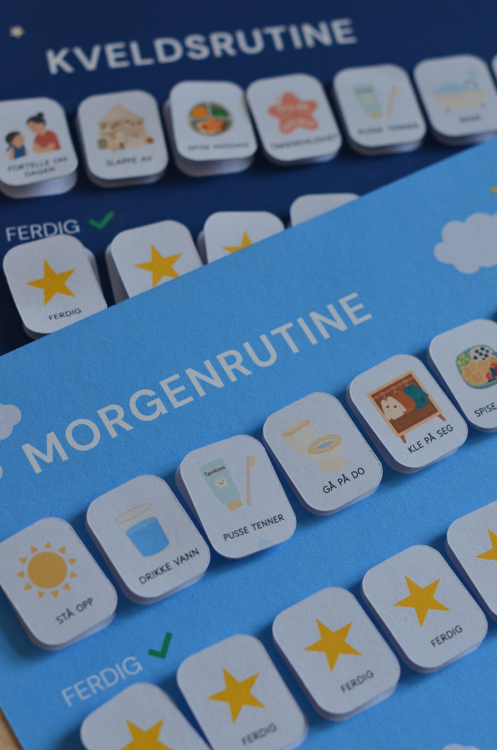 Med tavler for morgen og kveld, over 70 ikoner og et eget stjernebrett, får barnet en tydelig oversikt over dagens rutiner – og kan selv feste på stjerner når oppgavene er fullført.